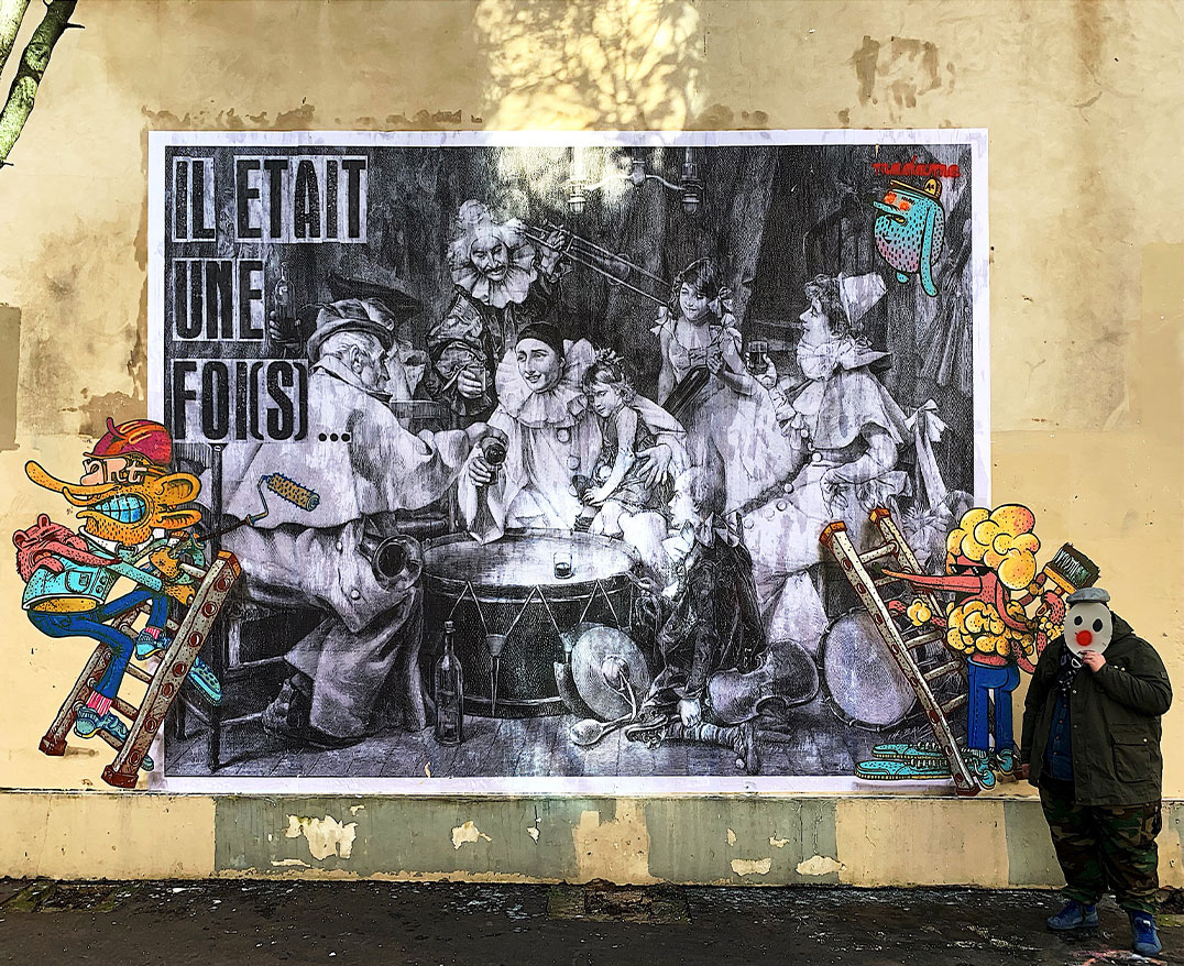 Madame ne griffe pas, Madame ne peint pas, mais Madame colle et maroufle ! Cette affichiste des temps modernes distille avec poésie un monde fantasque et provocant où l’extravagance règne. L’artiste détourne des photographies et gravures anciennes et y appose des textes insolents qui font sourire et interpellent les passants. Comédienne et scénographe de formation, elle déconstruit l’iconographie ancienne pour la faire parler d’aujourd’hui. En atelier, elle crée de petits formats qui sont des petites scènes en volume qu’elle transpose ensuite en de grandes affiches qu’elle appose dans la rue. Sa plume aiguisée et ses images éloignées des conventions esthétiques font penser au mouvement dadaïste qui insuffla un vent de liberté au début du XXI siècle. Madame, elle, déploie un style inédit dans le mouvement du street art. Entre résurrection du passé, absurdité et ésotérisme, les œuvres de Madame détonnent dans le paysage urbain.