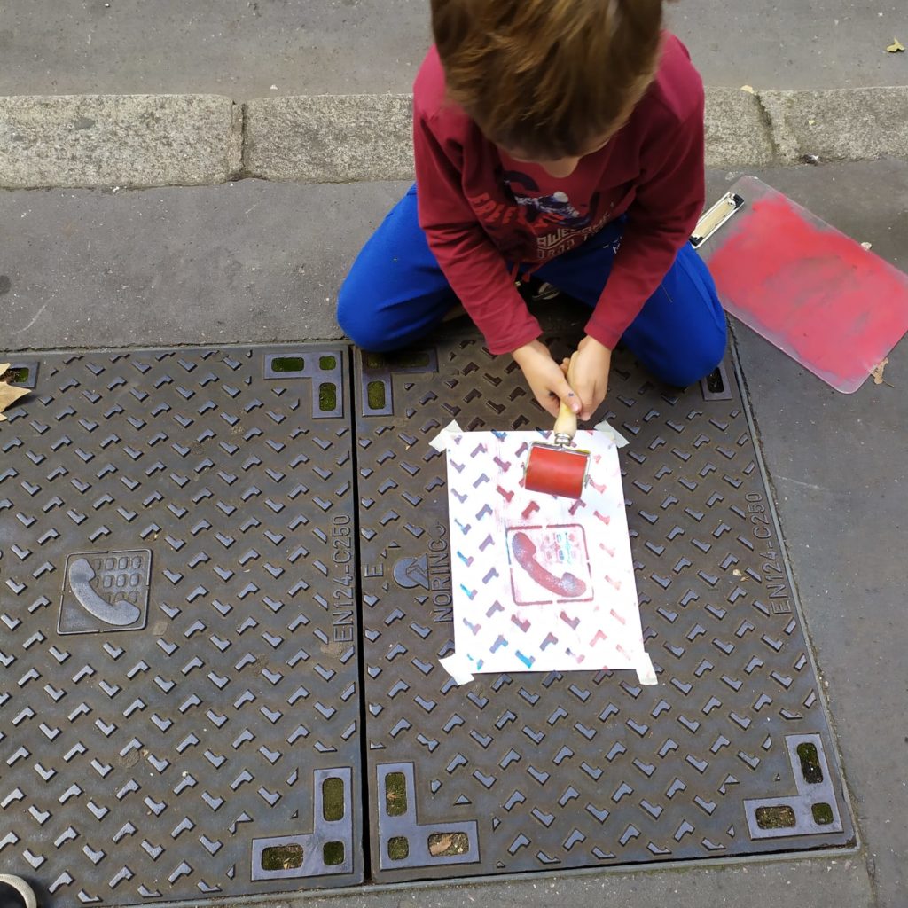 Déambulons dans les rues afin de réaliser un relevé « TYPOgraphique » de l’espace urbain.  Imprimons les inscriptions, les motifs, les trames que nous offre la rue et réalisons un petit répertoire de ce qui a attiré notre regard ! En cas de mauvais temps, nous utiliserons des matrices en relief en carton pour réaliser des estampages, des impressions, toujours avec nos rouleaux et de l’encre à l’eau !